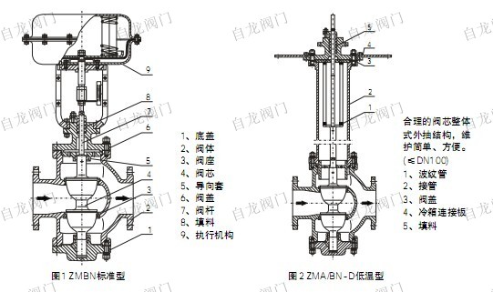 上海自龍閥門制造有限公司生產(chǎn)的ZMA(B)N型氣動薄膜雙座調(diào)節(jié)閥是自動控制系統(tǒng)中最常用的執(zhí)行器之一,閥內(nèi)有兩個閥座,流體通過閥芯與兩個閥座之間的上下密封面流出,因而流通能力,不平衡力小。適用于流量大、壓差大,泄漏量要求不高的場合。