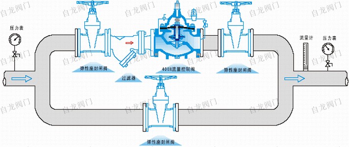 上海自龍閥門制造有限公司生產(chǎn)的400X流量控制閥由主閥、流量調(diào)節(jié)閥、針閥、導(dǎo)閥、球閥、微形過濾器和壓力表組成水力控制接管系統(tǒng)。利用水力自動操作,控制和調(diào)節(jié)主閥開度,使通過主閥的流量保持不變。400X流量控制閥利用水力自力控制,不需要其它裝置和能源,保養(yǎng)簡便,流量控制穩(wěn)定。400X流量控制閥廣泛用于高層建筑、生活區(qū)等供水管網(wǎng)系統(tǒng)及城市供水工程。當(dāng)閥門從進口端給水時,水流過針閥進入主閥控制室,并經(jīng)過導(dǎo)閥、球閥流出主閥控制室到出口,此時主閥處于全開或浮動狀態(tài)。調(diào)定主閥上部的流量調(diào)節(jié)閥,可為主閥設(shè)定一定開度。調(diào)節(jié)針閥開度和調(diào)節(jié)導(dǎo)閥彈簧壓力,即可使主閥開度保持在設(shè)定開度,并在壓力變化時導(dǎo)閥進行自動調(diào)節(jié),保持流量不變。