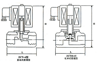 上海自龍閥門制造有限公司產(chǎn)的ZCT型電磁閥采用反沖式結(jié)構(gòu),它具有一次開閥和二次開閥的特點。電磁閥處于閉狀態(tài),當(dāng)電磁線圈通電,產(chǎn)生磁場吸起動鐵芯,打開閥塞導(dǎo)閥口,使閥塞上、下腔產(chǎn)生壓力差,將閥塞向上移動,電磁閥處于開狀態(tài)。當(dāng)介質(zhì)壓力,壓差小于0.05MPa(甚至為零)時、動鐵芯直接帶動閥塞,打開主閥口,電磁閥也可呈通路。斷電時,電磁閥靠復(fù)位彈簧,自重和壓力差關(guān)閉主閥口,電磁閥呈閉狀態(tài)。